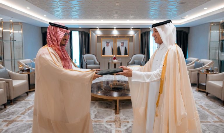 تسلم سعادة السيد سلطان بن سعد المريخي، وزير الدولة للشؤون الخارجية، اليوم، نسخة من أوراق اعتماد صاحب السمو الملكي الأمير سعد بن منصور بن سعد بن سعود بن عبدالعزيز آل سعود، سفير المملكة العربية السعودية الشقيقة لدى الدولة.