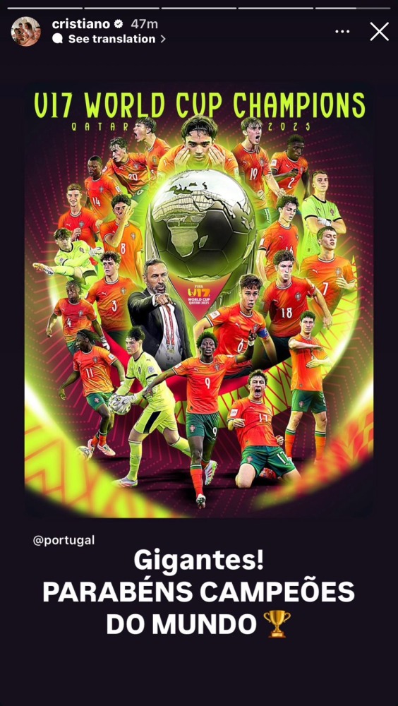وشارك الأسطورة البرتغالية هذه الرسالة عبر حسابه الرسمي على “إنستجرام”، حيث كتب: “عمالقة، مبروك يا أبطال العالم”، مؤكدًا فخره بالجيل الجديد من اللاعبين البرتغاليين.
