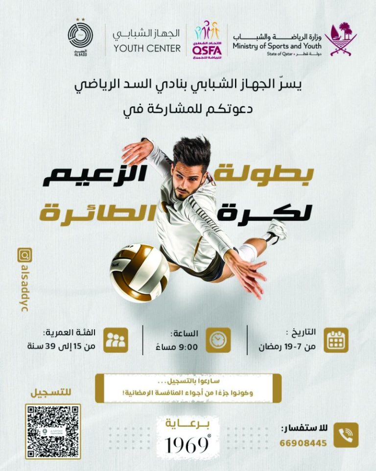 يشارك الاتحاد القطري للرياضة للجميع، تحت مظلة وزارة الرياضة والشباب، بالتعاون مع الجهاز الشبابي بنادي السد الرياضي في تنظيم بطولتي الزعيم لكرة القدم للصالات، والكرة الطائرة، ضمن روزنامة الأنشطة والبرامج الرياضية المجتمعية التي ينظمها الاتحاد خلال شهر رمضان الفضيل، وتبلغ قيمة الجوائز المالية المخصصة للبطولتين، 46 ألف ريال، موزعة بواقع 10 آلاف ريال للفريق الفائز بالمركز الأول، و8 آلاف ريال لصاحب المركز الثاني، و5 آلاف ريال للمركز الثالث، لكل بطولة على حدة، في خطوة تعكس الحرص على تحفيز المشاركين وتعزيز روح المنافسة الإيجابية.