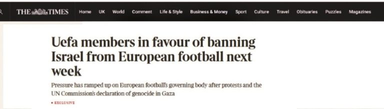 كشفت صحيفة «التايمز» البريطانية بأن أغلبية أعضاء اللجنة التنفيذية للاتحاد الأوروبي لكرة القدم «يويفا» تؤيد تعليق عضوية إسرائيل في منافسته الكروية.