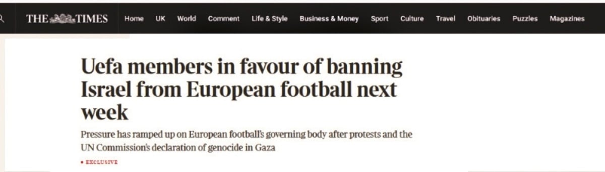 ونقلت الصحيفة عن مصادر إن «يويفا» سيحسم قراره بشأن تعليق عضوية إسرائيل، الأسبوع المقبل، وكانت الشرق قد انفردت بخبر اقتراب استبعاد الكيان الصهيوني من المسابقات الاوروبية في ظل تأييد معظم اعضاء المكتب التنفيذي في الاتحاد الاوروبي لذلك وهو ما اكدته صحيفة التايمز في هذا التقرير.