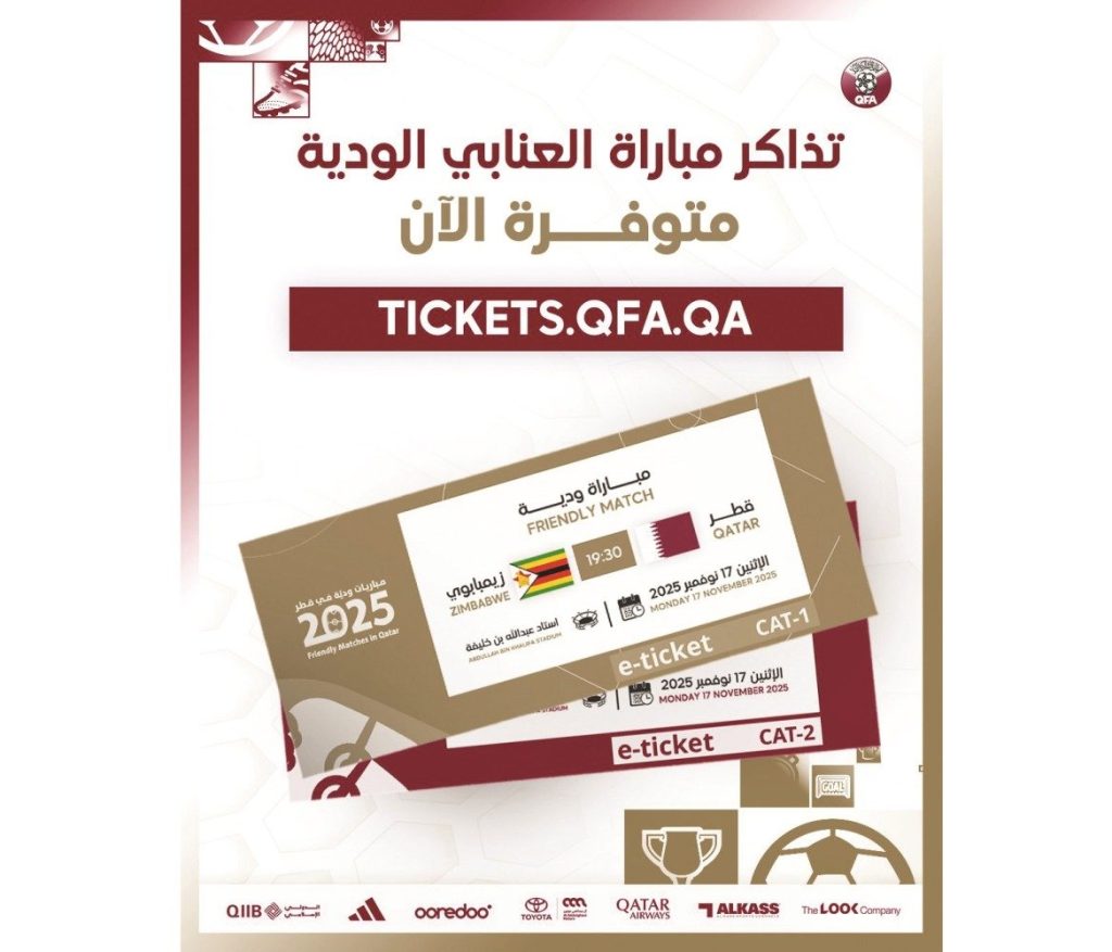 أعلن الاتحاد القطري لكرة القدم أمس عن طرح تذاكر المباراة الودية التي سيخوضها العنابي أمام منتخب زيمبابوي وديا يوم الإثنين المقبل على استاد عبد الله بن خليفة ضمن استعداداته لكأس العرب FIFA قطر 2025 ونهائيات كأس العالم 2026 التي ستستضيفها الولايات المتحدة الأمريكية والمكسيك وكندا.