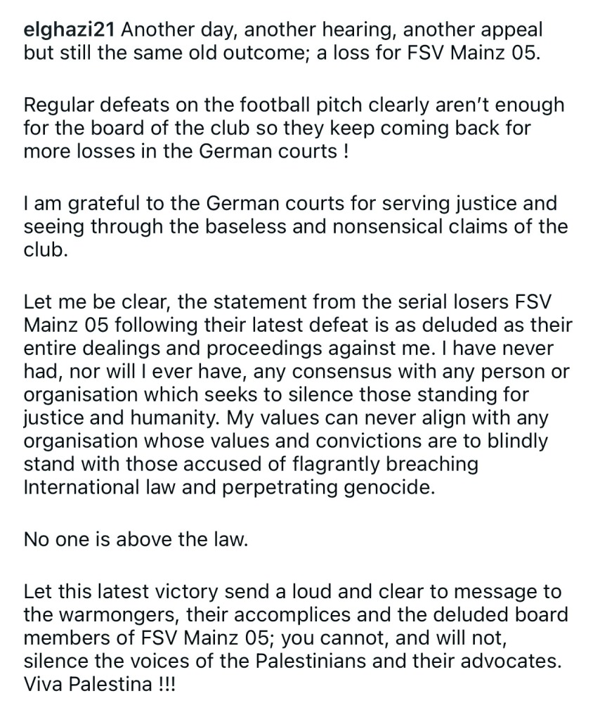 وأضاف الغازي قائلا : دعوني أوضح، بيان نادي إف إس في ماينز ، مُضلِّلٌ تمامًا كتعاملاتهم وإجراءاتهم ضدي. لم ولن أتفق أبدًا مع أي شخص أو منظمة تسعى إلى إسكات المدافعين عن العدالة والإنسانية. لا يمكن لقيمي أن تتوافق أبدًا مع أي منظمة تُعنى قيمها وقناعاتها بالوقوف إلى جانب المتهمين بانتهاك القانون الدولي بشكل صارخ وارتكاب إبادة جماعية، لا أحد فوق القانون ، لن تستطيعوا، ولن تُكمموا، أصوات الفلسطينيين ومناصريهم. فلتحيا فلسطين!”.