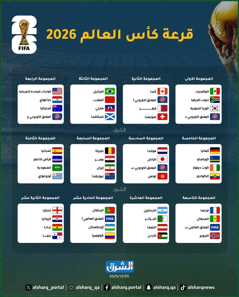 ‫ تعرف على مجموعات كأس العالم 2026 ومواجهات المنتخبات العربية