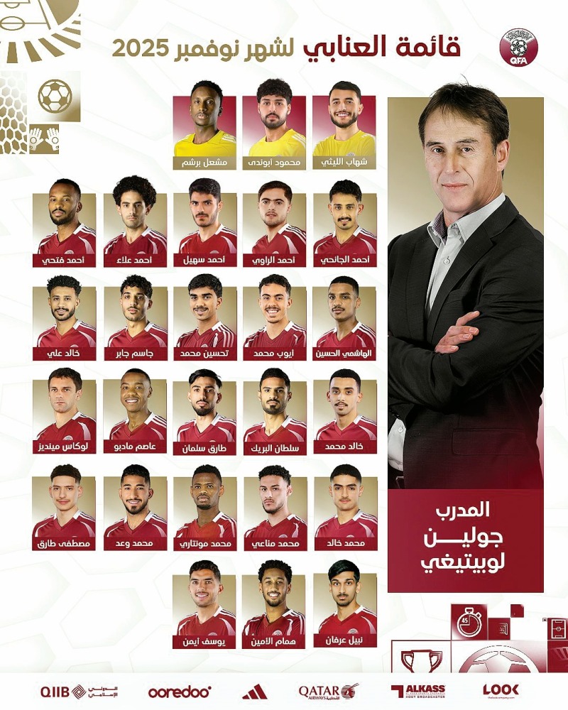 أعلن الإسباني جولين لوبيتيغي مدرب العنابي عن قائمة منتخبنا الوطني المعنية بخوض المعسكر التحضيري لمواجهة مباراة زيمبابوي الودية يوم 17 نوفمبر الجاري، بالدوحة ضمن استعدادات بطل آسيا لمشاركته في بطولة كأس العرب 2025، ونهائيات كأس العالم 2026 بأمريكا وكندا والمكسيك، وضمت قائمة منتخبنا 26 لاعبا هم في حراسة المرمى الثلاثي مشعل برشم ومحمود أبو ندى وشهاب الليثي، وأحمد الجانحي وأحمد الراوي وأحمد سهيل وأحمد علاء وأحمد فتحي والهاشمي الحسين وأيوب محمد وتحسين محمد وجاسم جابر وخالد علي، وخالد محمد وسلطان البريك وطارق سلمان وعاصم مادبو ولوكاس مينديز ومحمد خالد ومحمد المناعي ومحمد مونتاري ومحمد وعد ومصطفى طارق ونبيل عرفان وهمام الأمين ويوسف أيمن. واعتمد مدرب العنابي على قائمة شابة خلال هذا المعسكر وإراحة اللاعبين المخضرمين وأصحاب الخبرة كمكافأة لهم بعد ضمان التأهل لكأس العالم 2026، وضمان جاهزيتهم الكبيرة تحسبا لنهائيات كأس العرب التي ستنطلق يوم 1 ديسمبر المقبل، وسيخوض العنابي البطولة العربية ضمن المجموعة الأولى بجانب منتخبات تونس والفائز من مباراة سوريا وجنوب السودان والفائز من مباراة فلسطين وليبيا في التصفيات.