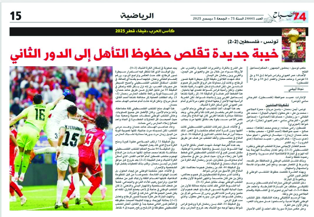 وشددت الصحيفة أن المنتخب التونسي تكبد مجددا نتيجة سيئة جديدة بعدما تلقى هزيمة من منتخب سوريا في الجولة الأولى بهدف دون رد مشيرة إلى أن منتخب تونس بات أقرب لتوديع المسابقة العربية بعدما جاء في المركز الثالث برصيد نقطة واحدة.