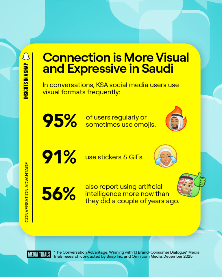 بحث مشترك لسناب شات وMCN يرصد انتقالًا متزايدًا في السعودية نحو المحادثات المرئية والتعبيرية داخل الدردشة الخاصة، مع اتساع استخدام أدوات مدعومة بالذكاء الاصطناعي. وتقول الدراسة إن 85% لا يمانعون رسائل العلامات التجارية في المحادثات، بينما أفاد 66% بشعور إيجابي بعد تلقي رسالة مباشرة.